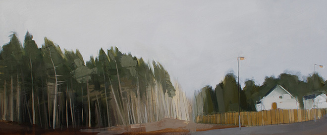 It is a conversation between art forms - a meditation on landscape, narrative and memory. The series reflects several points of transition: between poem and painting; absence and presence; public and private; urban landscapes and outlying, peripheral spaces. The work is a quiet celebration of that which is ephemeral and overlooked, as it finds meaning and beauty in this forgotten ground.